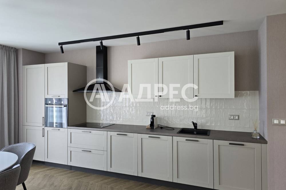 Кухня - конфигурация Диалог - естествен масив, гръб - Vintage плочки. Електроуреди - аспиратор Elica Missy, мивка със смесител Schock, съдомиялна машина, фурна и котлони Bosch, хладилник за вграждане Liebher, кафемашина Nespresso Essenza mini white, магнитна шина с осветително тяло тип Led линеен спот и цилиндричен спот, вграден кош за отпадъци, разделител за прибори.