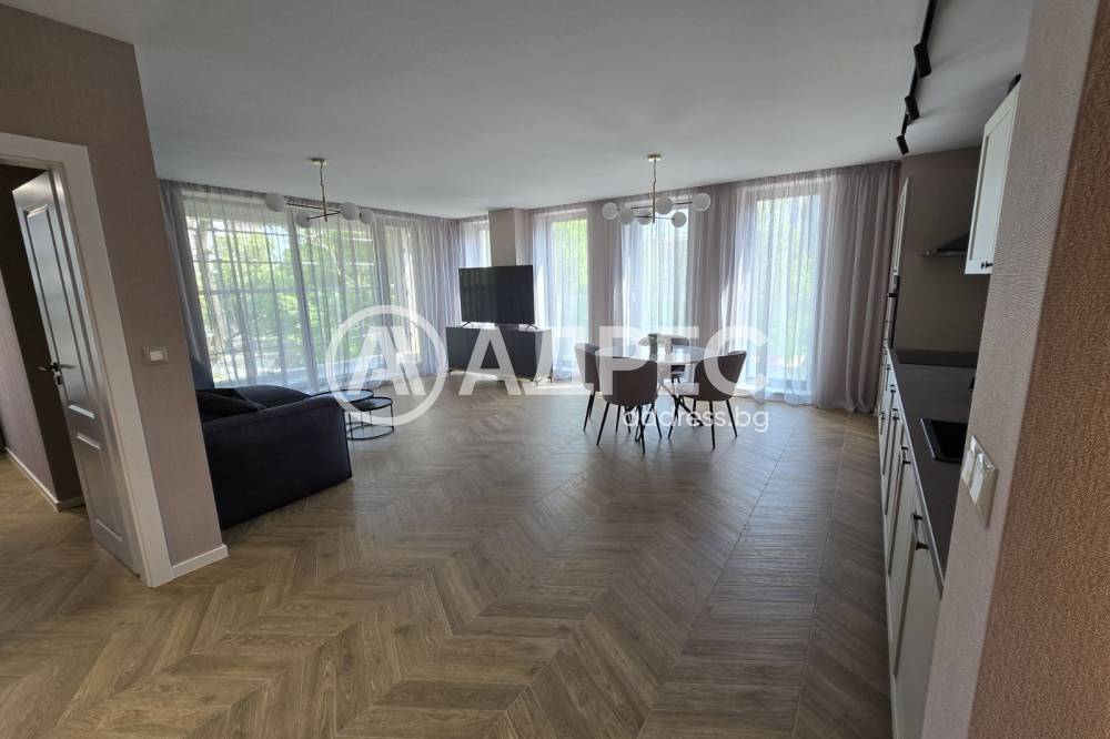 Всекидневна: италиански мебели - триместен диван с три възглавници и лежанка, ТиВи модул, столове Risskov, трапезна маса, холни маси 2 броя, картина, осветително тяло тип полилей с шест топки, климатик Daikin Amura, телевизор Samsung 65 инча, корниз и пердета Miroxdecorq стопери за врата.