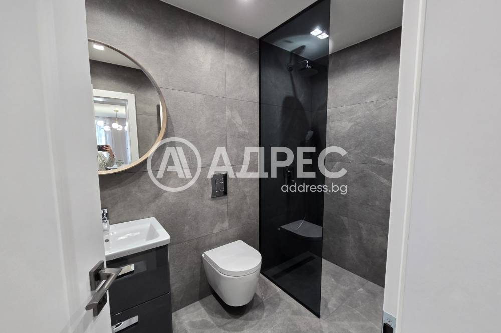 Баня - италиански гранитогрес, вградена структура комплект 3 в 1 Grohe с бутон, висящ шкаф с мивка с 2 чекмеджета и плот Roca, смесител Hansgrohe, конзолна тоалетна чиния Rimless, душ пита Hansgrohe, смесител за вграждане на вана/душ Hansgrohe, интимен душ с шлаух Hansgrohe, електрическа алуминиева лира за баня Atlantic, огледало, вентилатор за баня, подов сифон с клапа и воден затвор, линеен сифон, стъклен параван по индивидуален проект.
