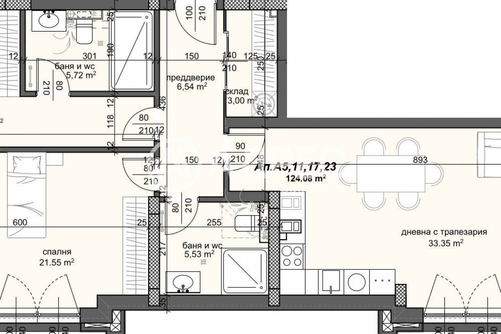Тристаен апартамент, състоящ се от: дневна с трапезария, две спални, две бани с тоалетни, склад и две тераси. Подобни апартаменти се предлагат на различни етажи.