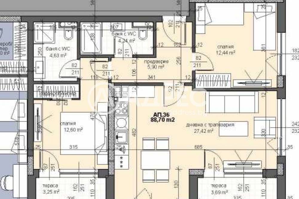 На Вашето внимание представяме тристаен апартамент с чиста квадратура от 88,70 кв.м , състоящ се от хол с кухненски бокс , две спални , две санитарни помещения. Изложението на жилището е западно.Жилището е с акт 16!