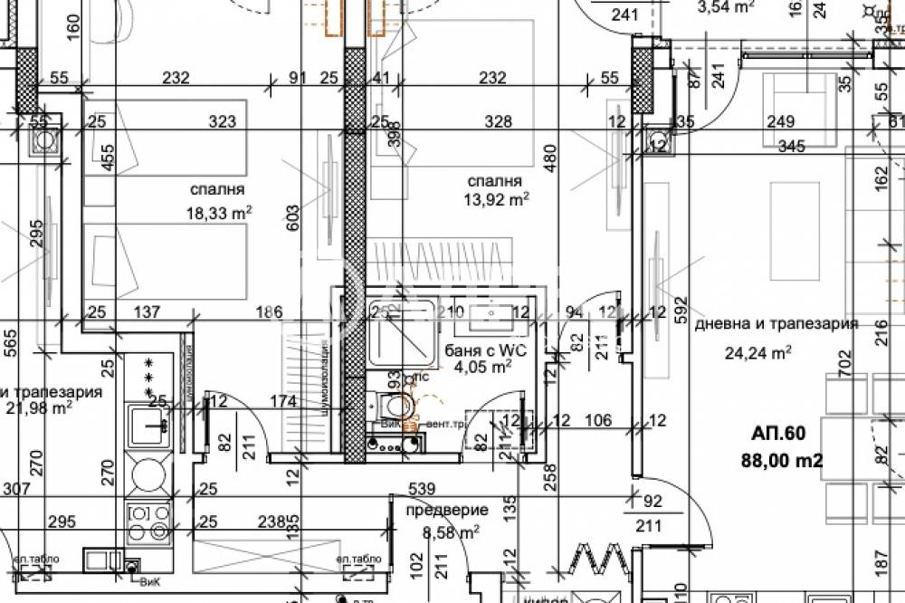 Тристаен апартамент със следното разпределение: входно антре, дневна с трапезария и кухненски бокс, две спални, килер, баня с тоалетна и тераса.
