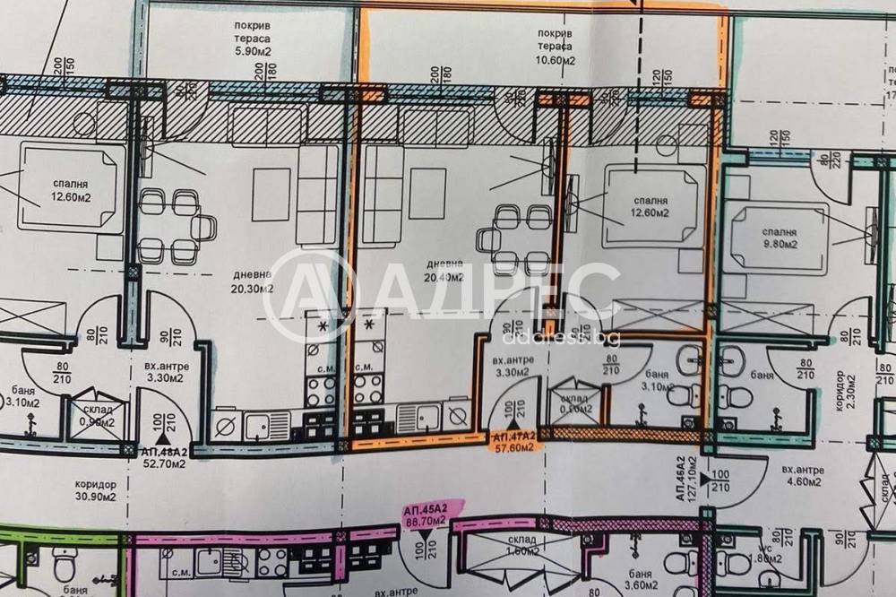 Представяме Ви двустаен апаратмент, находящ се в район Южен. Апартаментът е със застроена площ 57.60 квадратни метра и има следното разпределение: входно антре, дневна с кухненска част, спалня, баня с тоалетна, склад и покрив-тераса.