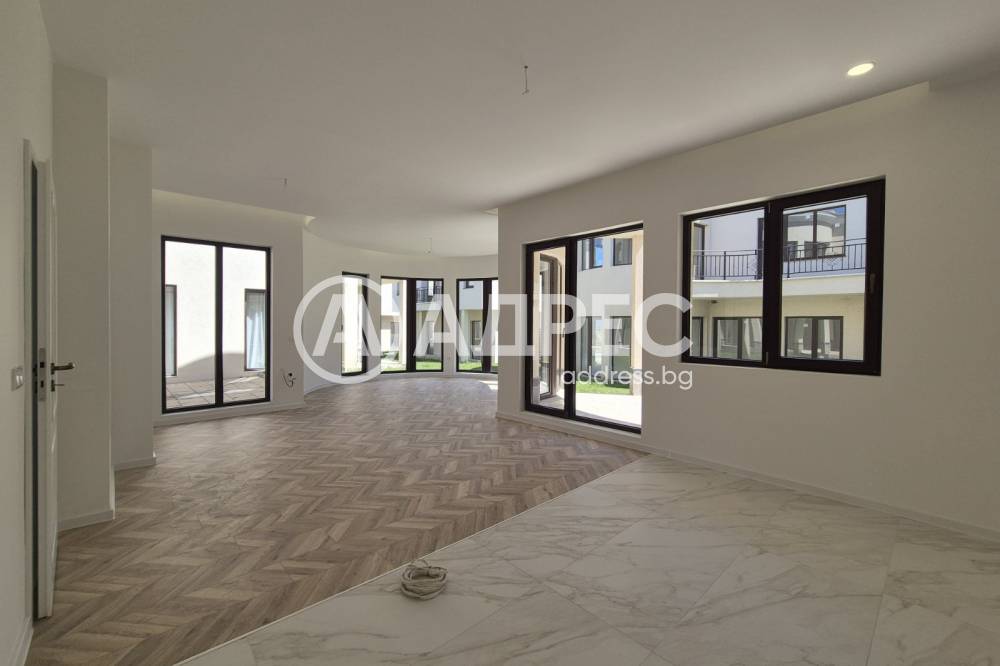 На първия етаж е разположена кухнята и трапезарията, баня с тоалетна, мокро помещение, гардеробно помещение и гостната, която се намира в ротондата на къщата.,излаз на просторна тераса с изглед към вътрешния двор.