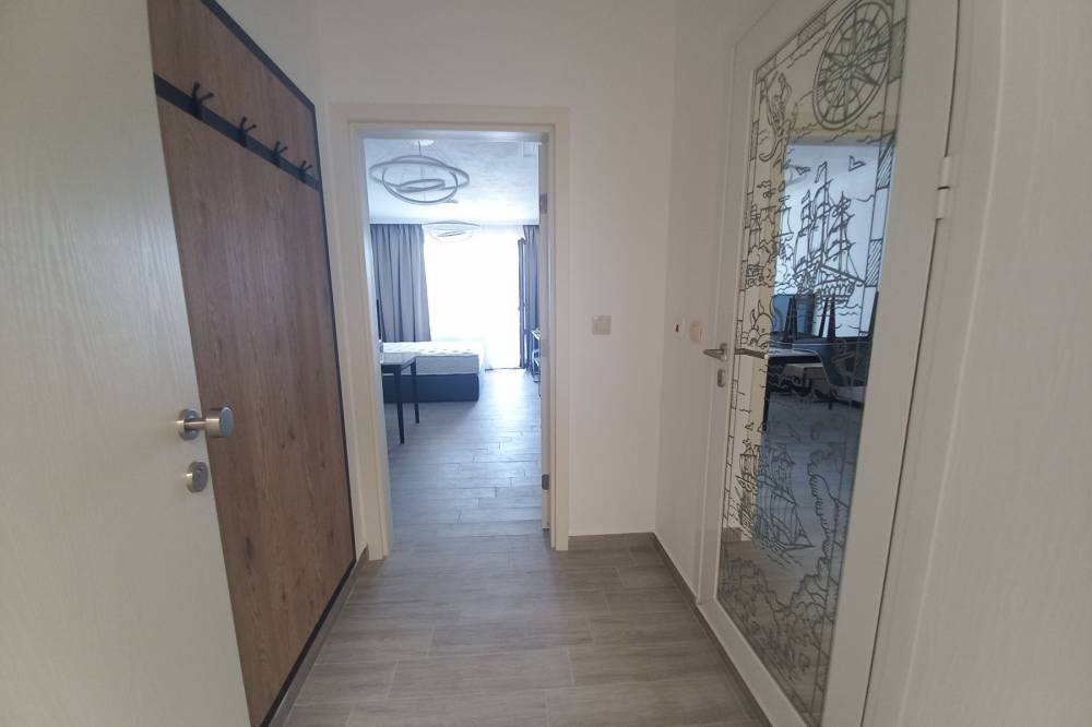 Едностаен апартамент в нова жилищна сграда в Поморие с Акт 16. Намира се на 450 метра от морето. Имотът е с площ 47 кв. м, етаж 3 от 6, асансьор. Състои се от коридор, просторна стая с кухненски бокс и спален кът, баня с тоалетна и тераса.
