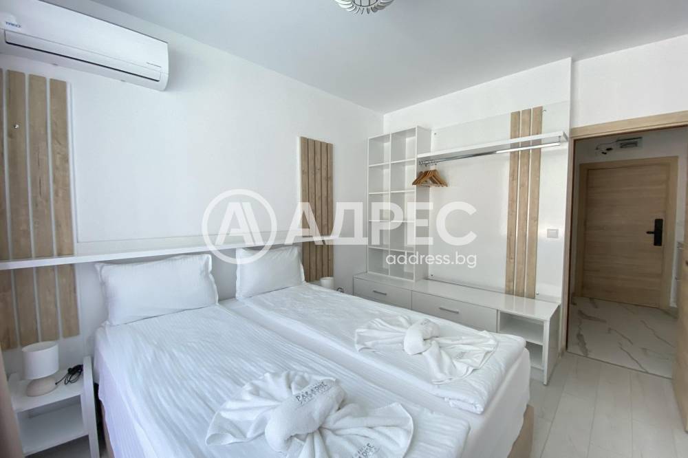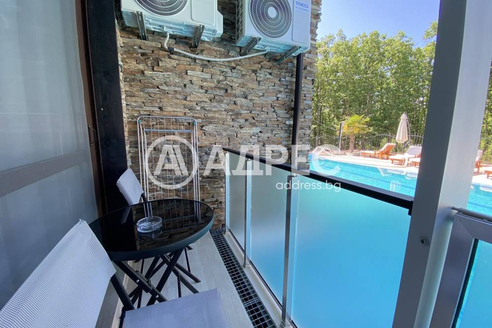 Двустаен апартамент в гр. Приморско. Площ на имота 47,92 кв. м., етаж 1 от 6. Имотът се състои от антре, дневна и спалня, баня с тоалетна и тераса, от която може да влезете в басейна. Излиза от дневната и е прекрасно място за отдих за всички обичащи уединението.