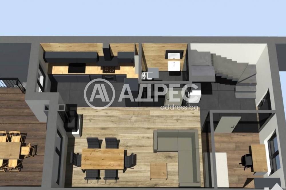 Втори етаж: спалня с дрешник и собствена баня, отделно две спални, баня, мокро помещение, тераса.