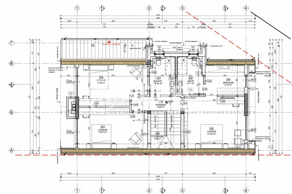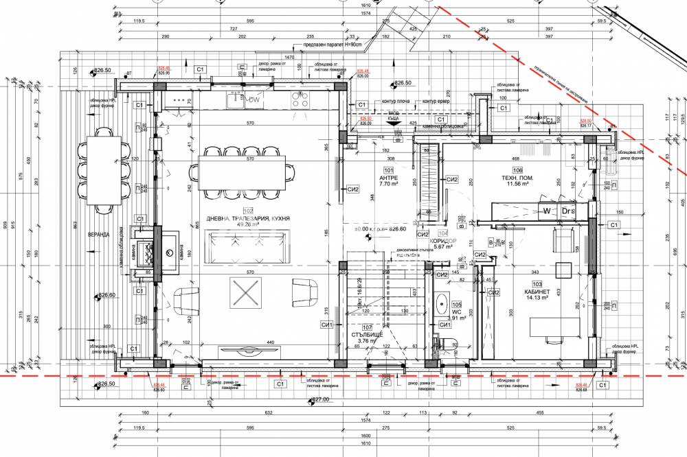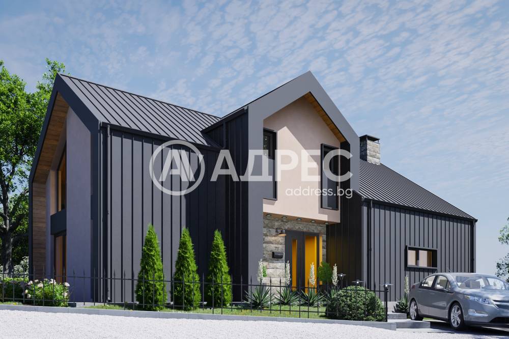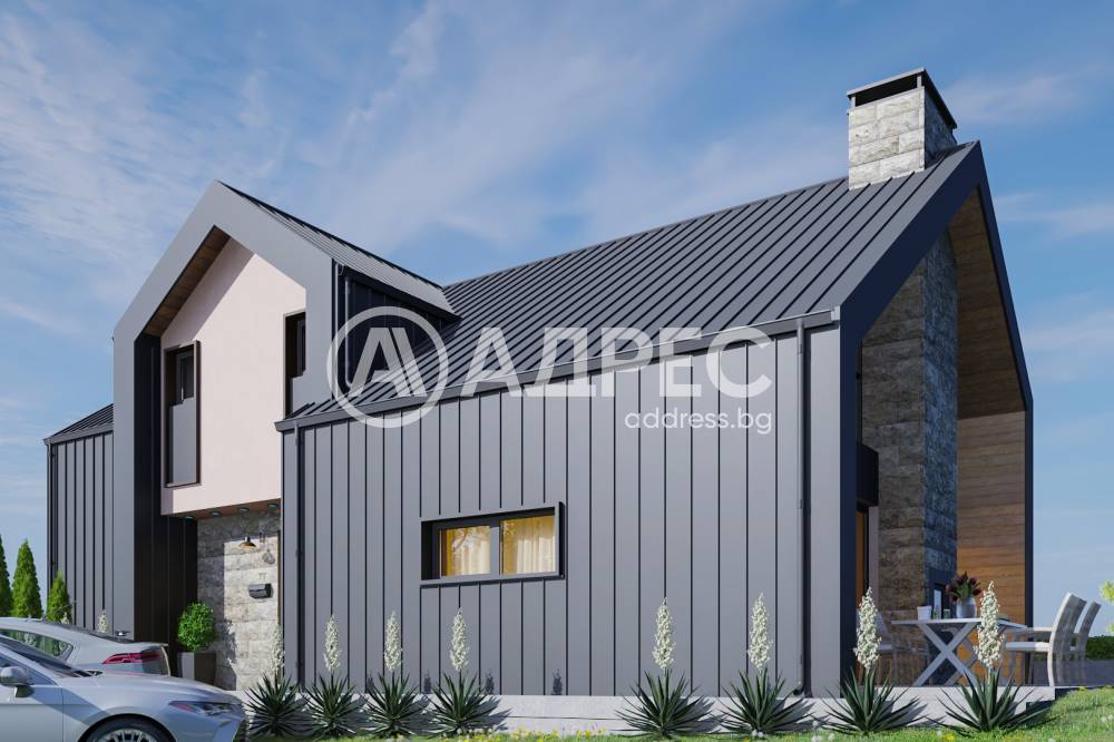 Конструкцията на къщата е монолитна, проектирана е с модерна визия, високи тавани и френски прозорци.