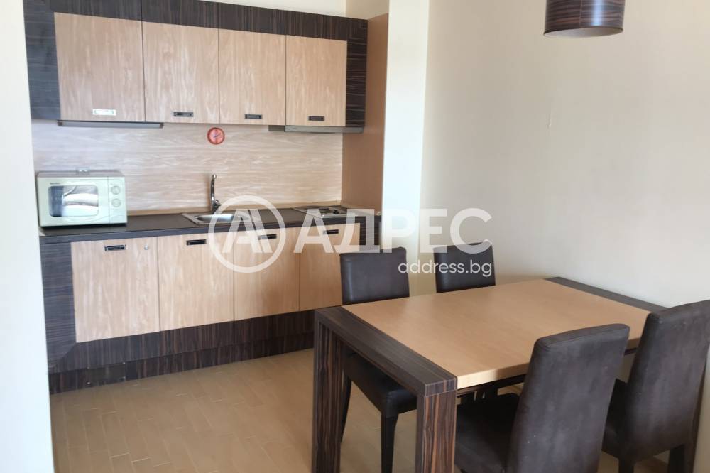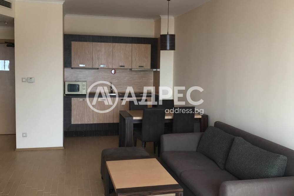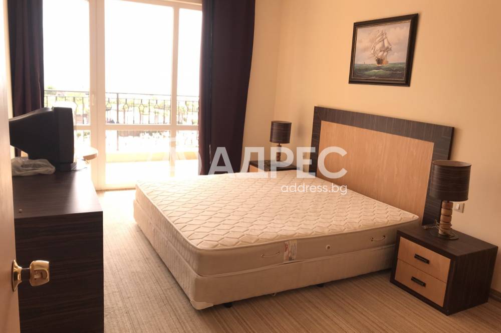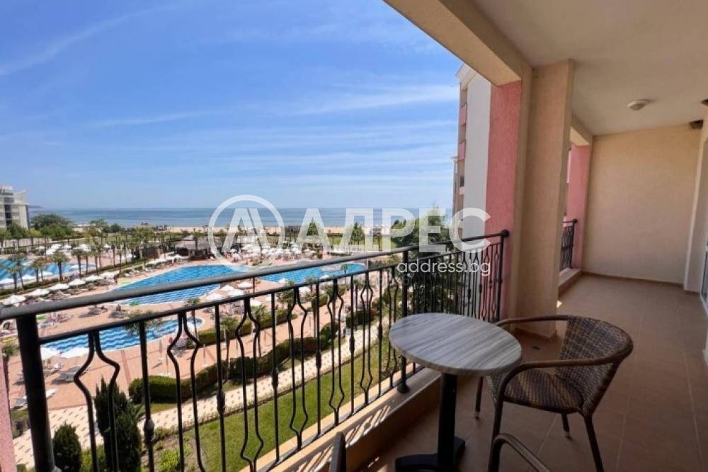 Двустаен апартамент в Слънчев бряг с панорама море. Апартаментът е с жилищна площ 84 кв. м., намира на пети етаж от девет. Състои се от хол с кухненски кът, спалня, баня с тоалетна и тераса пред двете стаи. Обзаведен, готов за живене или отдаване под наем. Такса поддръжка 1200 евро за година. Възможност за паркиране.