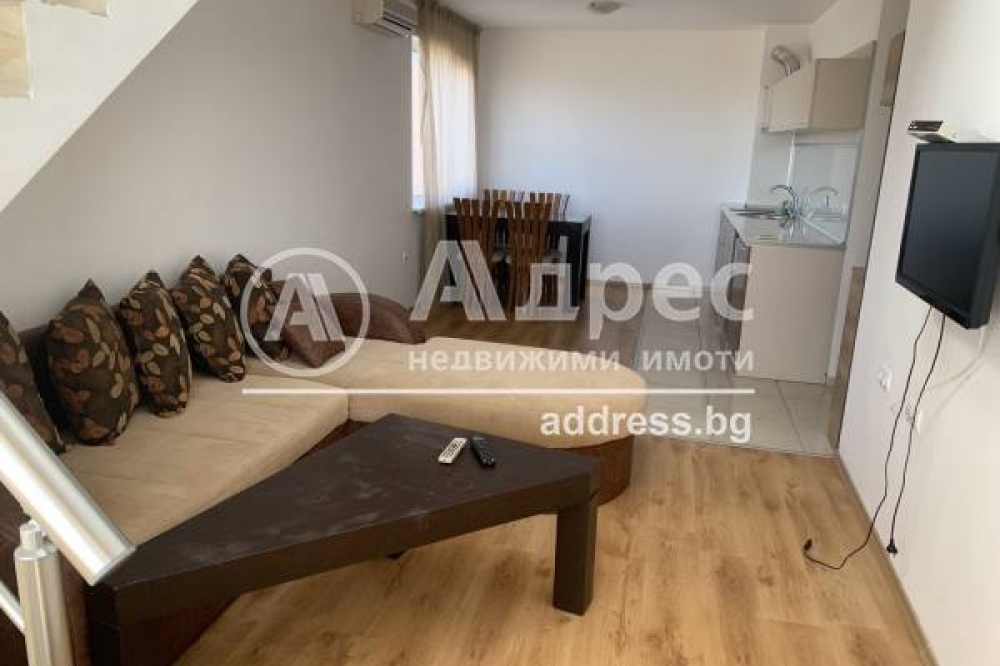 Двустаен просторен мезонет в комплекс от затворен тип в Слънчев Бряг. Апартаментът е с площ от 84 кв. м., ет. 4 с асансьор. Състои се от: етаж 1: просторна всекидневна с кухненски бокс, баня с тоалетна и тераса; етаж 2: обширна спалня и баня с тоалетна. Имотът се намира близо до известният плаж Какао Бийч. Комплексът предлага плувен басейн, шезлонги и чадъри, фитнес зала, рецепция, контролиран достъп, частен паркинг и хранителен магазин.