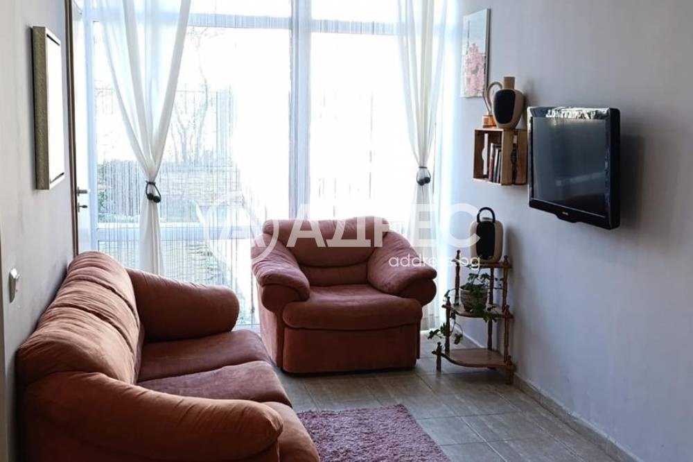 Двустаен апартамент в затворен комплекс в Слънчев бряг. Близо до Какао бийч. Площ на имота 51.50 кв. м., етаг 1 /партер/. Състои се от коридор, дневна с кухненски кът и тераса, спалня, баня с тоалетна. Напълно обзаведен и оборудван. Такса поддръжка 500 евро на година.