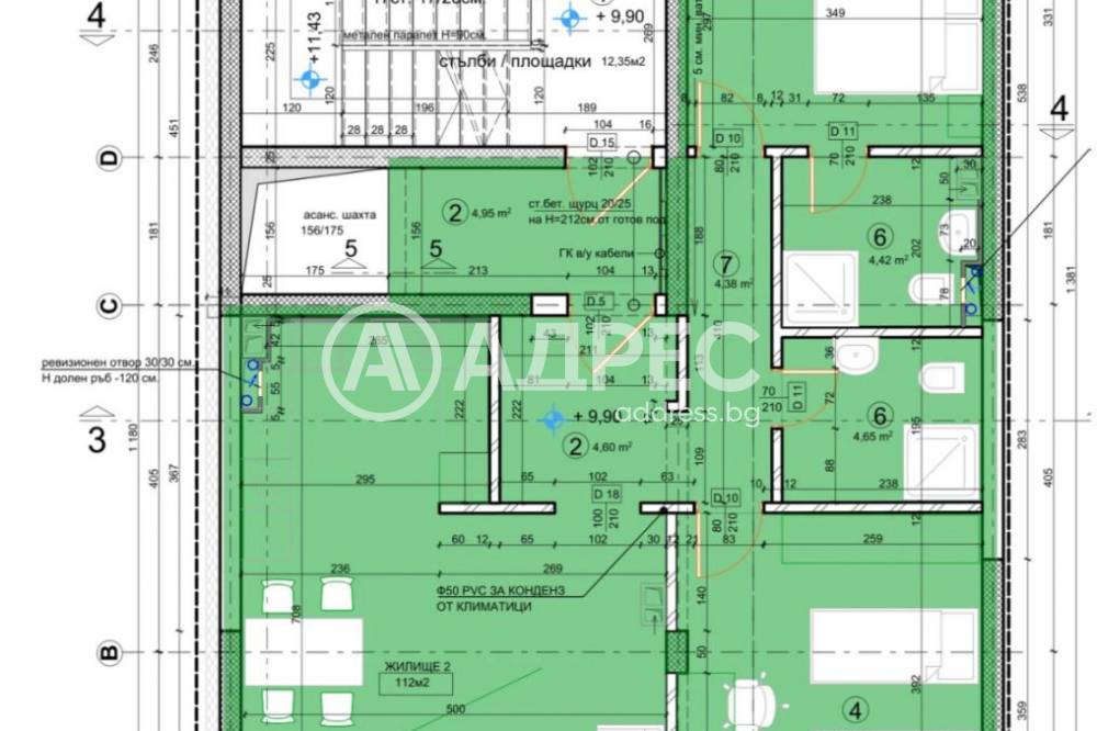 Апартамент №2 Тристаен апартамент, разположен на кота +9.90 м, с чиста площ 112 кв.м и обща площ 135,29 кв.м. Разпределението включва: входно антре дневна с трапезария и кухненски бокс коридор спалня с тераса детска стая баня с тоалетна втора баня с тоалетна. Към имота принадлежи мазе №2 с площ 6,78 кв.м.