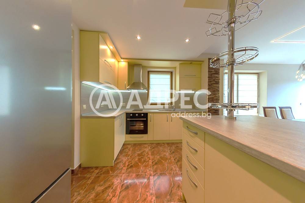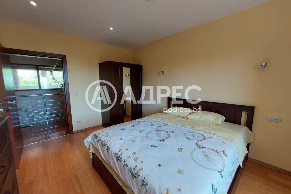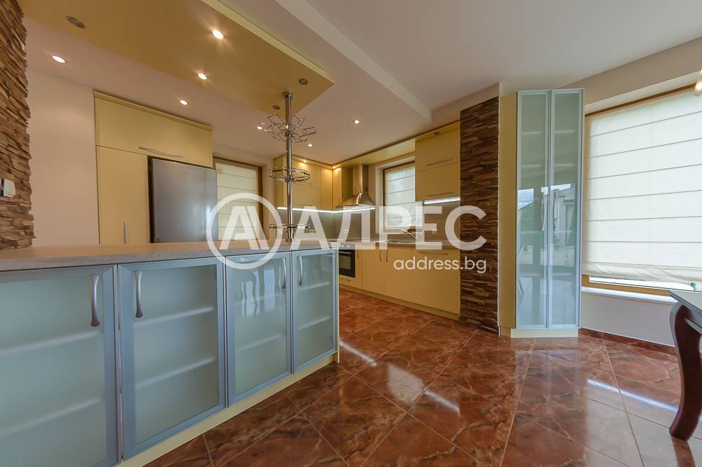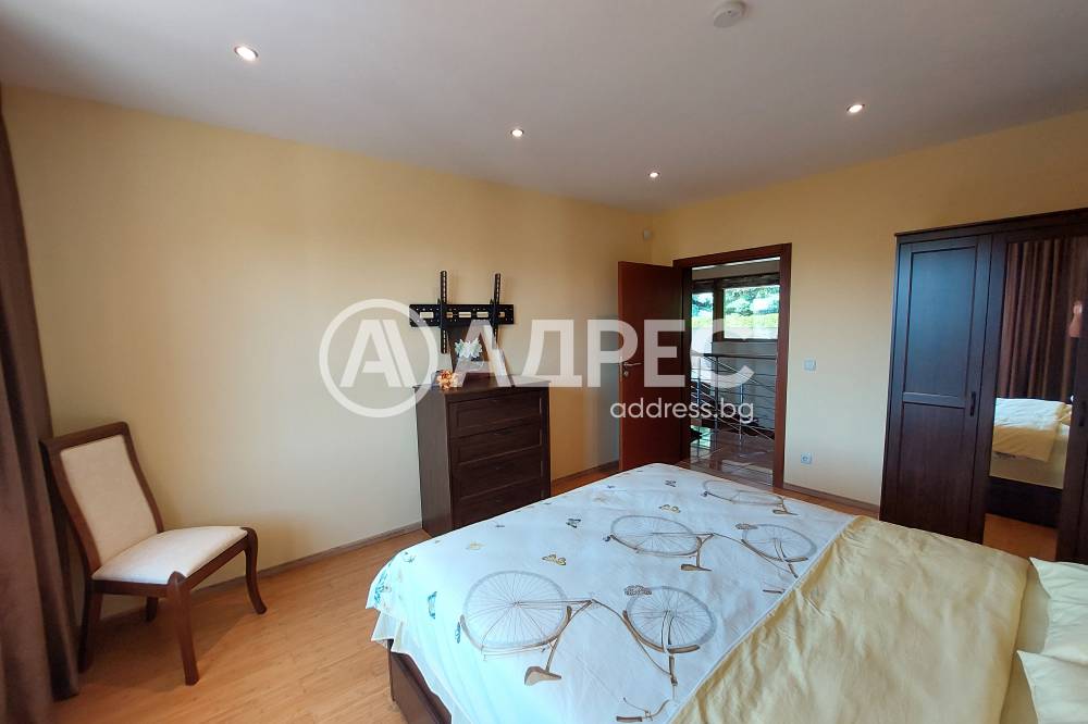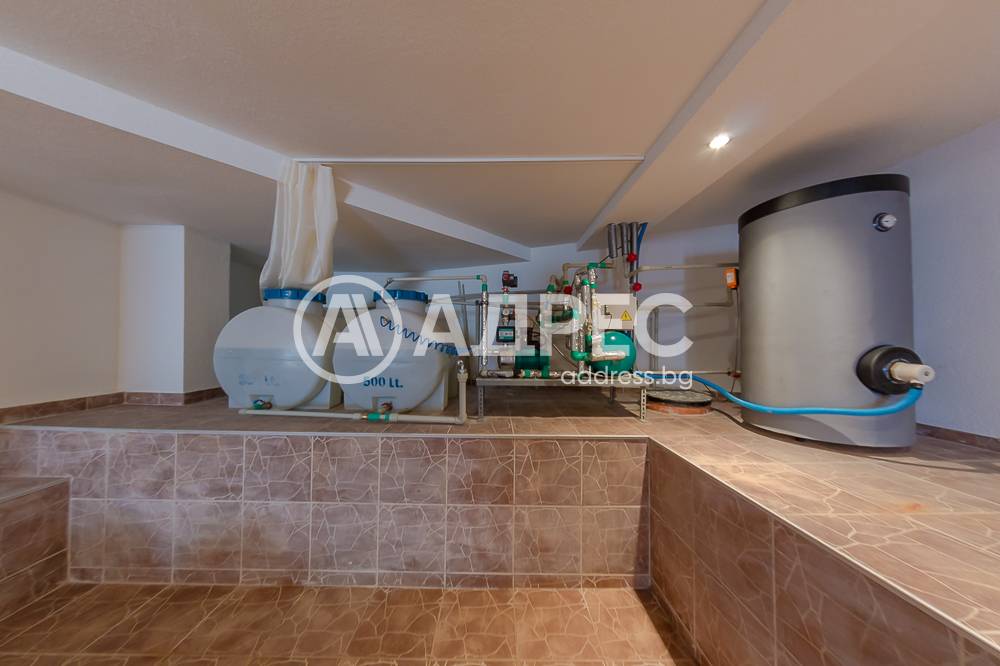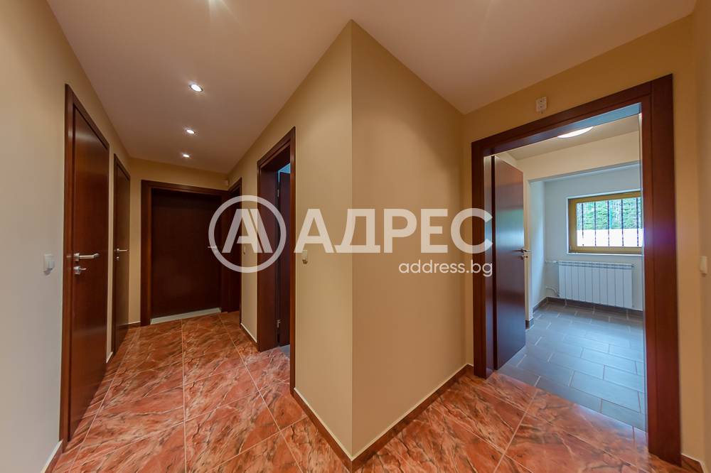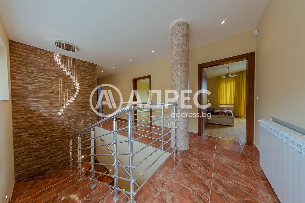 На първото ниво /177 кв.м/ са разположени югоизточно ориентиран хол с излаз на веранда; голяма двустранна камина с инверторно отопление за цялото ниво; камината разделя холната от трапезарната част; обособена светла светла кухня с излаз към втора веранда и връзка с барбекю къта; коридор към помощните помещения. На същото ниво има топла връзка с гараж за две коли /35 кв.м/, изцяло завършен с настилки и латекс. Може да се използва и за офисно помещение. Котелно, сервизно помещение, дрешник и килер за храна. На второто ниво /133 кв.м/ са разположени три самостоятелни спални, всяка с излаз на тераса. Две санитарни помещения, дрешник и голяма артистична средиземноморска тераса с гледка към планината. Сутеренът /65,40 кв.м/ е завършен като помещение, подходящо за винарска изба или за фитнес.