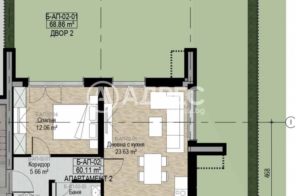 Двустаен апартамент, състоящ се от: дневна с кухненски бокс, спалня, баня с тоалетна, коридор, склад и двор. Към жилището има възможност да се закупи гараж или паркомясто.