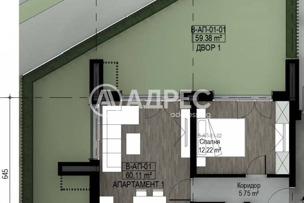Двустаен апартамент, състоящ се от: коридор, дневна с кухненски бокс, спалня, баня с тоалетна, склад и прилежащ с площ от 59,38 кв.м.