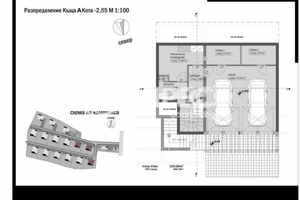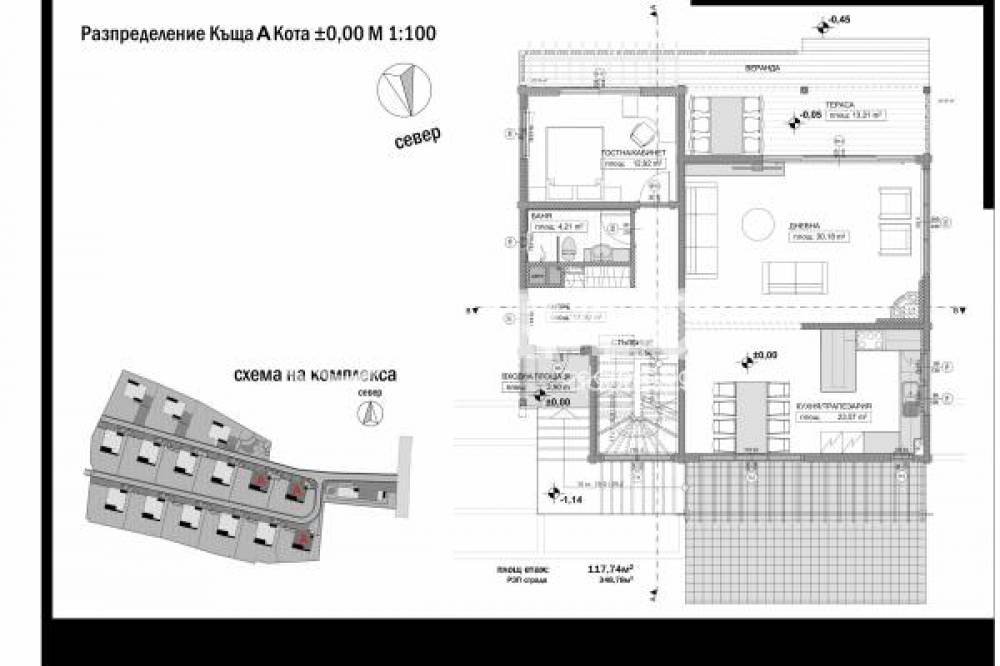 Къща в Бояна тип А 2, е с обща квадратура 361 кв.м. разгъната застроена площ (РЗП). С Акт 16. В сутерена са разположени: техническо помещение, складови помещения, перално с достатъчно място за сушене на дрехи, фитнес зала с бар и баня с тоалетна. На първия етаж над сутерена са разположени: входно антре, коридор, просторна кухня с трапезария, всекидневна с камина, спалня за гости (може да бъде кабинет, киносалон и др.), самостоятелна баня с тоалетна и огромна тераса на север с прекрасна гледка към София. За Вашето удобство и комфорт стаите са с височина 3 метра. На втория етаж са разположени: коридор, две бани с тоалетни и три големи спални, като едната има собствен дрешник и баня 11 кв.м. Две от спалните излизат на голяма тераса на север с гледка към София. Къщата разполага с двоен гараж с поставена електрическа щора. В страни от къщата на същото ниво на открито има площадка за две паркоместа. Цената на имота е без ДДС.