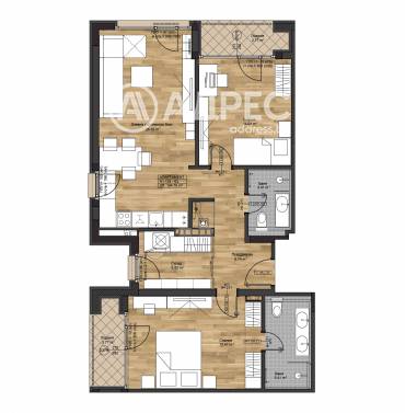 Тристаен апартамент на втори надпартерен етаж със ЗП 104.76кв.м. Състои се от хол с кухненски бокс 26,32 кв.м., спалня 17,47кв.м. с баня към нея , втора спалня 14кв.м. предверие, склад, баня с тоалетна и две лоджии.