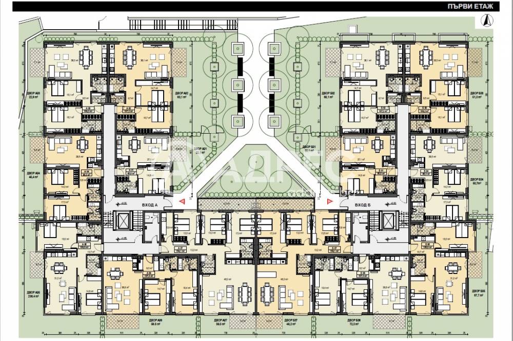 Тристаен апартамент с разполагащ с двор от 50 кв.м. просторна дневна, две спални и две бани с тоалетна.