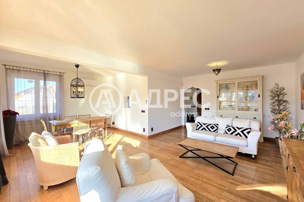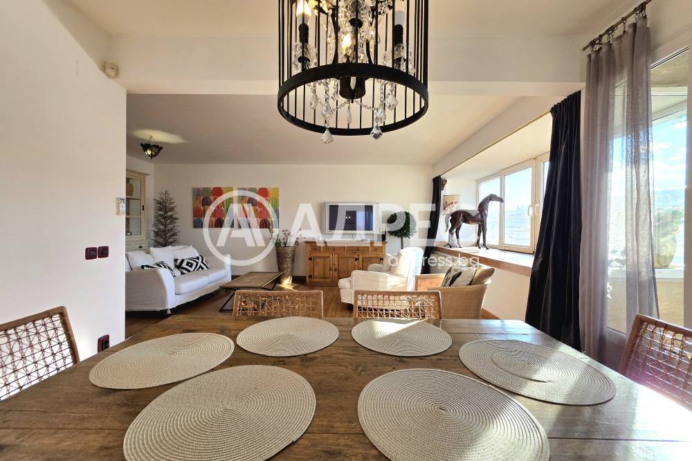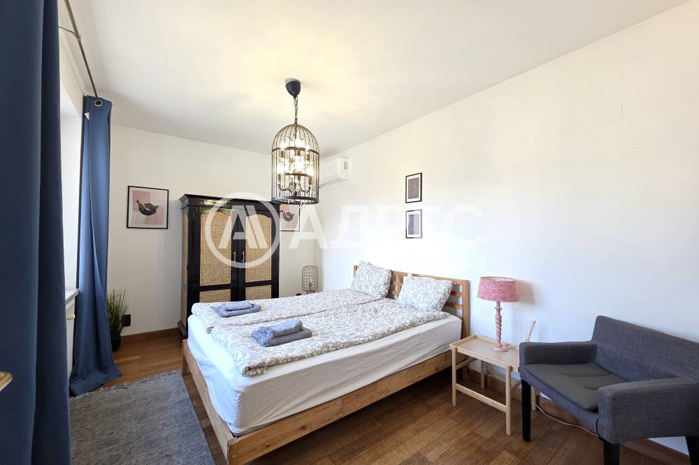 Жилището впечатлява с просторна дневна зона с обособен кът за почивка. Интериорът е решен в светли тонове, с дървени подове и стилно подбрани мебели, създаващи уют и комфорт.