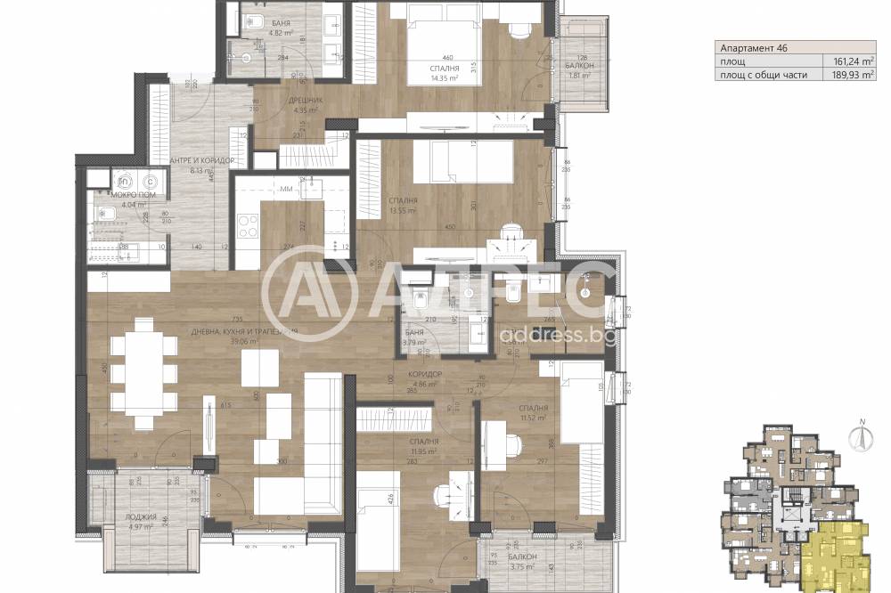 Многостаен апартамент за продажба в нова жилищна сграда пред Акт 15 в кв. "Дианабад", район "Изгрев" с обща площ от 189,93 кв. м. Състои се от входно антре с коридор и мокро помещение, всекидневна с трапезария, кухня и лоджия, родителска спалня с дрешник и балкон и още 3 спални с 2 бани и балкон. Предвидени са рекуператори с възможност за доставяне на свеж кислород в жилищните помещения. Намира се на 4-ти етаж от общо 7. Изложението е юг/изток.