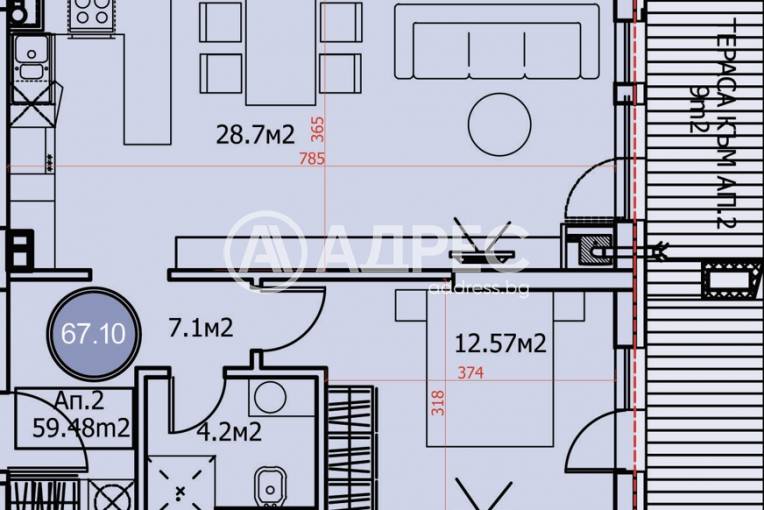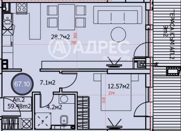 АПАРТАМЕНТ 02 е разположен на първи жилищен етаж (партер) със застроена площ от 59.48 кв.м. жилищна площ, отделно 9.00 кв.м. собствен двор.