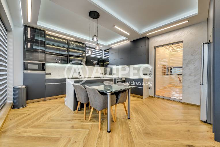 Функционална и елегантна къща в затворен комплекс от само 11 къщи. Построена 2020г с модерна визия тази къща има 4 спални, просторен и уютен хол с високи тавани 3,2м, сепарирана кухня със сензорна врата, отопляема зимна градина и двор /520кв.м/ с директен излаз от хола.