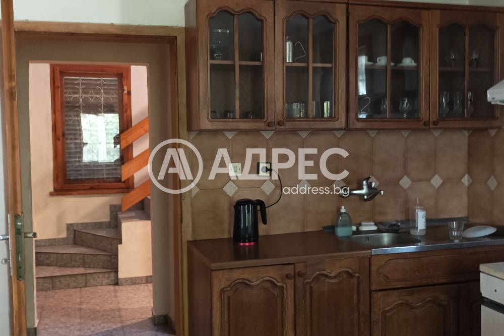 Първи етаж-голяма трапезарияс кухня и санитарен възел.Голяма тераса със стълби към вътрешната част на двора.