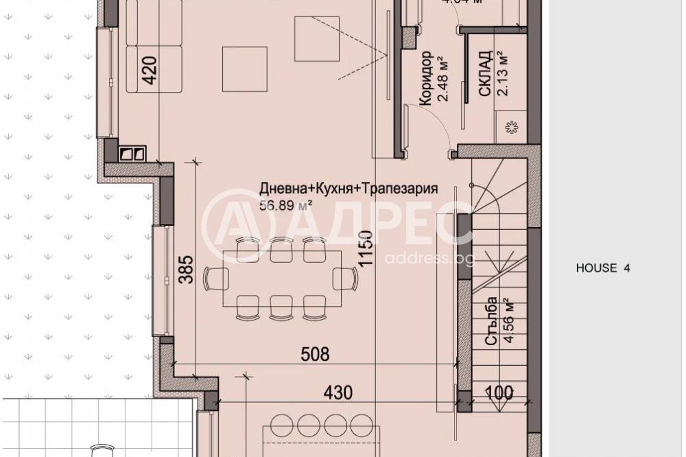 Редова къща №3 с РЗП-371 кв.м. на 4 етажа, в комплекс от общо 6 къщи в един парцел-2137кв.м., разпределена по следния начин; сутерен-гараж, приземен етаж-дневна, кухня,трапезария, склад, тоалетна, първи етаж-три спални, две бани/тоалетни, мокро помещение, втори етаж-спалня, баня/тоалетна, две тераси.