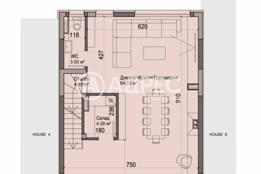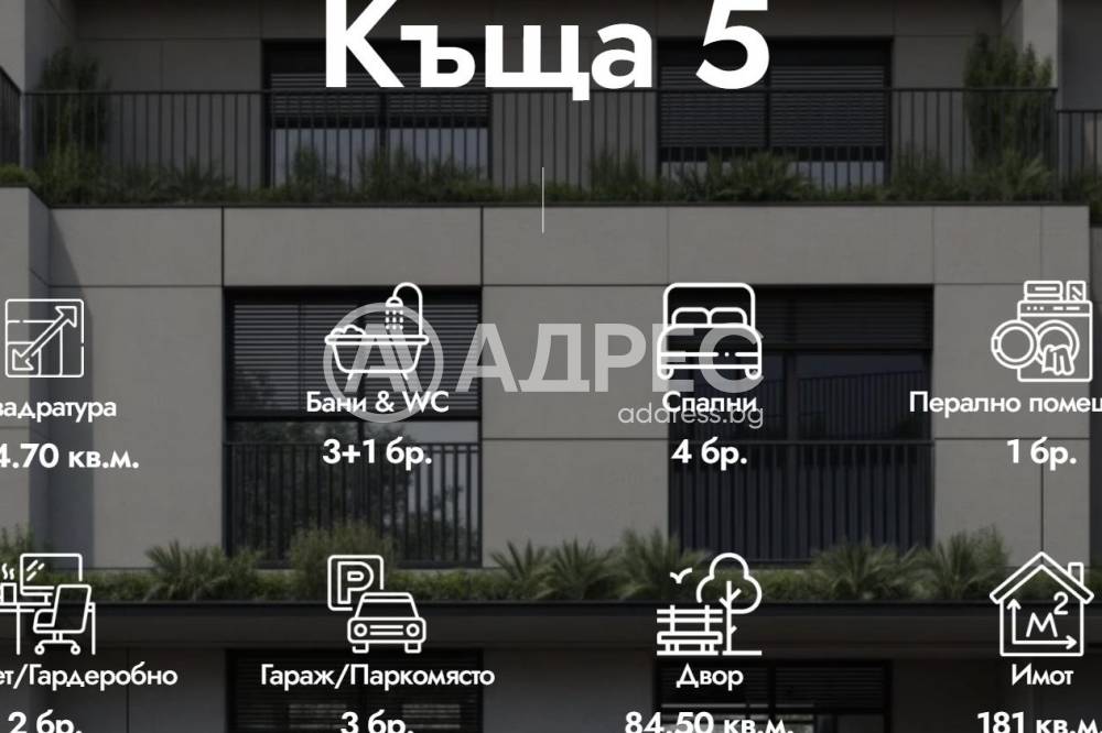 Редова къща №5 с РЗП 395кв.м. на 4 етажа, в комплекс от общо 6 къщи в един парцел-2137кв.м., разпределена по следния начин; сутерен-гараж, приземен етаж-дневна, кухня,трапезария, склад, първи етаж-три спални, две бани/тоалетни, мокро помещение, втори етаж-спалня, баня/тоалетна, дрешник, две тераси.