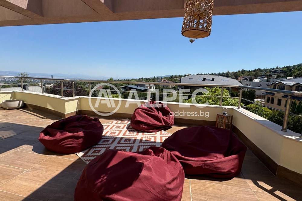 Просторен многостаен, непреходен, напълно обзаведен апартамент в полите на Витоша,, в затворен комплекс от 2005 г. Апартаментът е с уникална панорамна 180° гледка към Витоша и София.