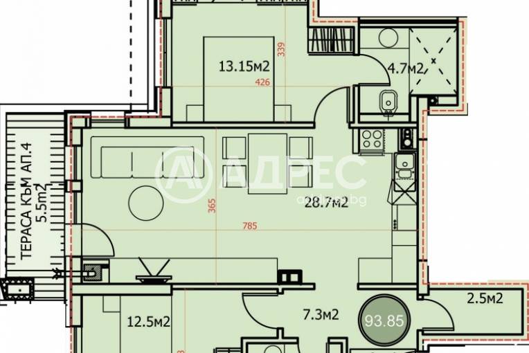 АПАРТАМЕНТ 04 е разположен на първи жилищен етаж (партер) със застроена площ от 83.19 кв.м. жилищна площ, отделно 5.50 кв.м. собствен двор/тераса.