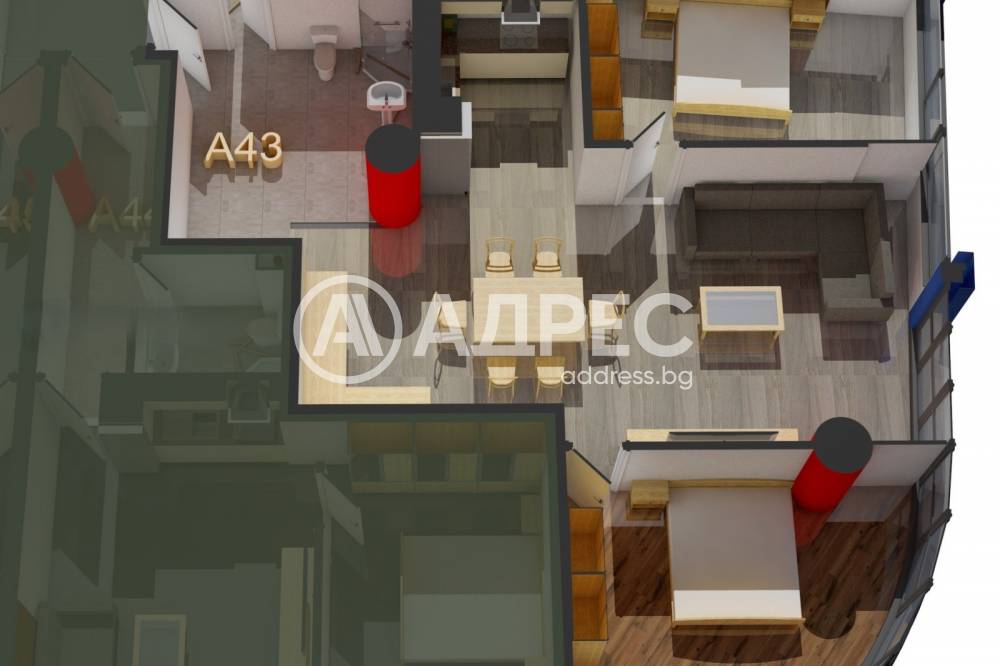 Жилището е изключително просторно, състои се от предверие, два санитарни възела - голяма и малка баня и отделно самостоятелно мокро помещение, изключително просторна дневна (9х5м.) с кухненски бокс (3,2х3,2м.), и две самостоятелни единични стаи.