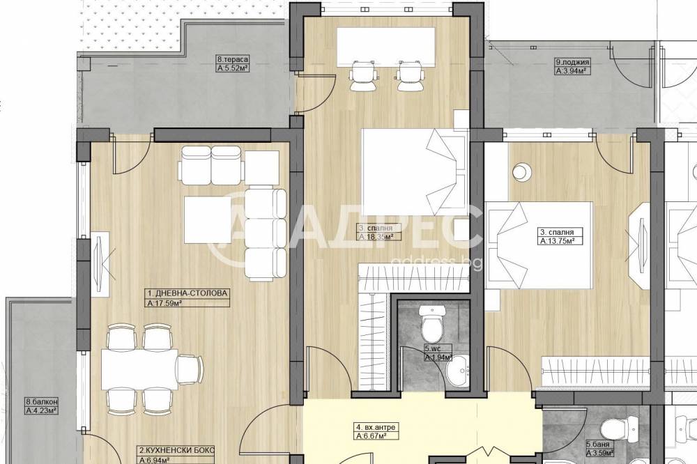 - Тристаен апартамент, състоящ се от вхоно антре, всекидневна с кухненски бокс, две спални, баня с тоалетна, отделна тоалетна, дрешник и три тераси.