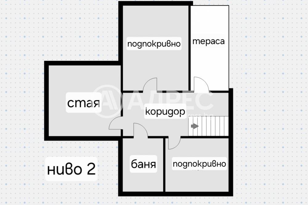 Втори етаж (80 кв.м.): вътрешни стълби, сходно разпределение, възможност за обособяване като отделно жилище, на места има скосявания.
