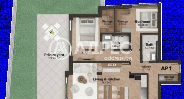 Входно антре, просторна всекидневна с кухненски бокс и трапезария, три спални, три бани с тоалетни, склад, веранда и собствен двор с площ 152,84 кв.м.!