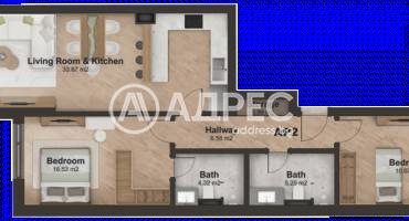 Входно антре, просторна всекидневна с кухненски бокс и трапезария, две големи спални, две бани с тоалетни, склад и тераса!