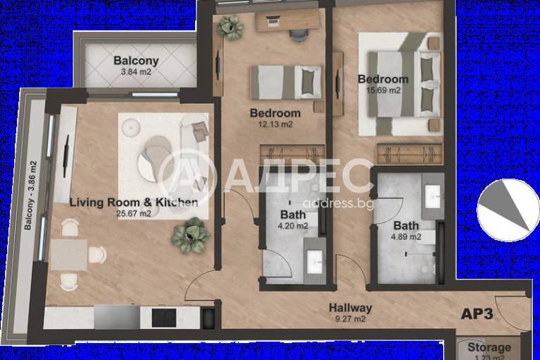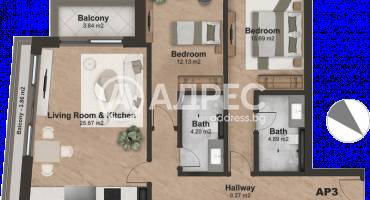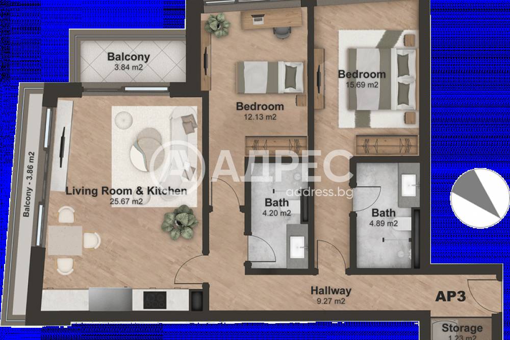 Входно антре, просторна всекидневна с кухненски бокс и трапезария, две големи спални, две бани с тоалетни, склад и две тераси!