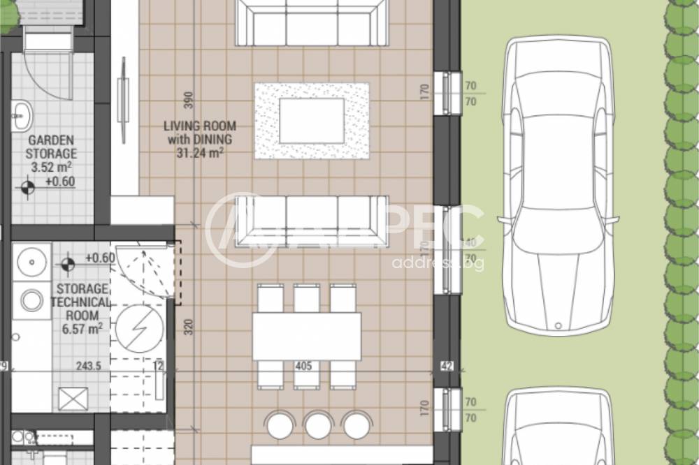 Кокетна двуетажна къща в богато озеленен комплекс. РЗП на къщата-156,46 кв.м.; застроена площ Етаж 1-79,82 кв.; застроена площ; етаж 2-76,64 кв. м. Към имота има прилежащ двор с площ- 247,6 кв. м., от които двор + веранда-167,87 кв. м. Разпределение: дневен тракт с кухня, сервизно помещение, тоалетна, градински склад, двор + веранда, 3 спални, 2 бани с тоалетни. Изложение: Изток, Запад. Две ПМ в имота.