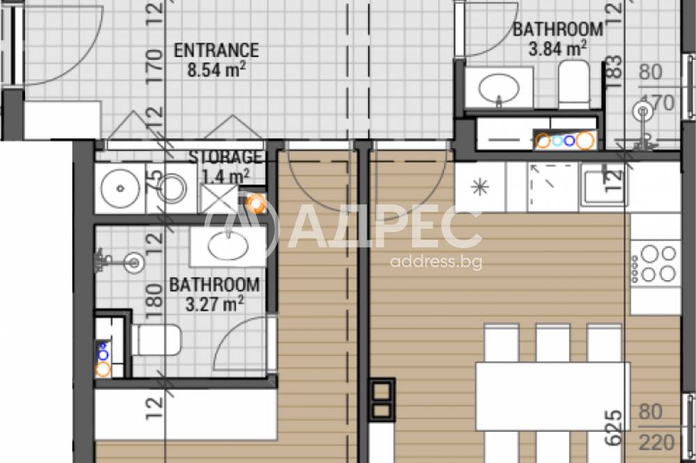 Многостаен апартамент на етаж ТРЕТИ със ЗП-112,48 кв.м., РЗП-139,65 кв.м., идеални части от парцела равняващи се на 117,41 кв.м. Разпределение: Дневен тракт с кухня, 3 спални, 2 бани с тоалетни, склад, тераса. Изложение: Североизток, Югозапад.
