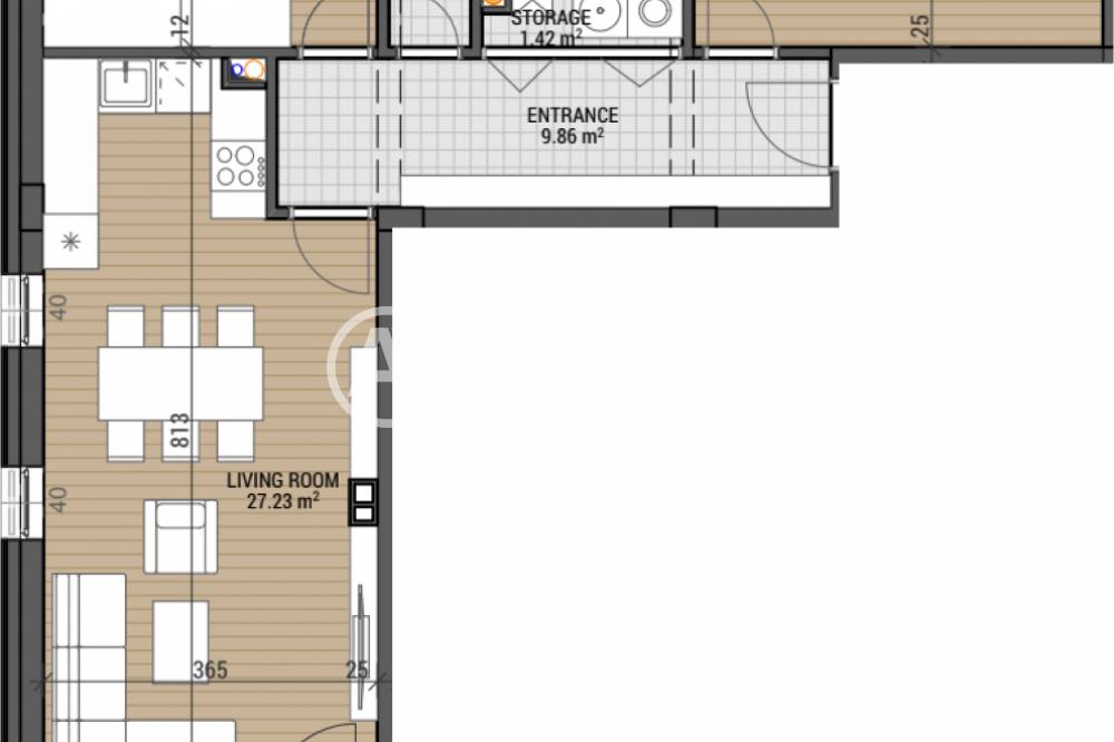 Тристаен апартамент на етаж ВТОРИ със ЗП-104,9 кв.м., РЗП-126,36 кв.м., идеални части от парцела равняващи се на 109,50 кв.м. Дневен тракт с кухня, 2 спални, 2 бани с тоалетни, склад, лоджия. Изложение: Североизток, Югозапад.