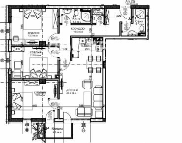 Разпределение: Просторна дневна зона с големи прозорци, които осигуряват много естествена светлина, три спални, две бани с тоалетна, складово помещение, тераса и антре.