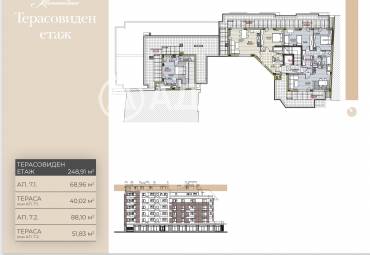 Тристаен апартамент състоящ се от: антре, дневна с кухненски бокс,две спални, баня с тоалетна, тоалетна, склад и две тераси.
