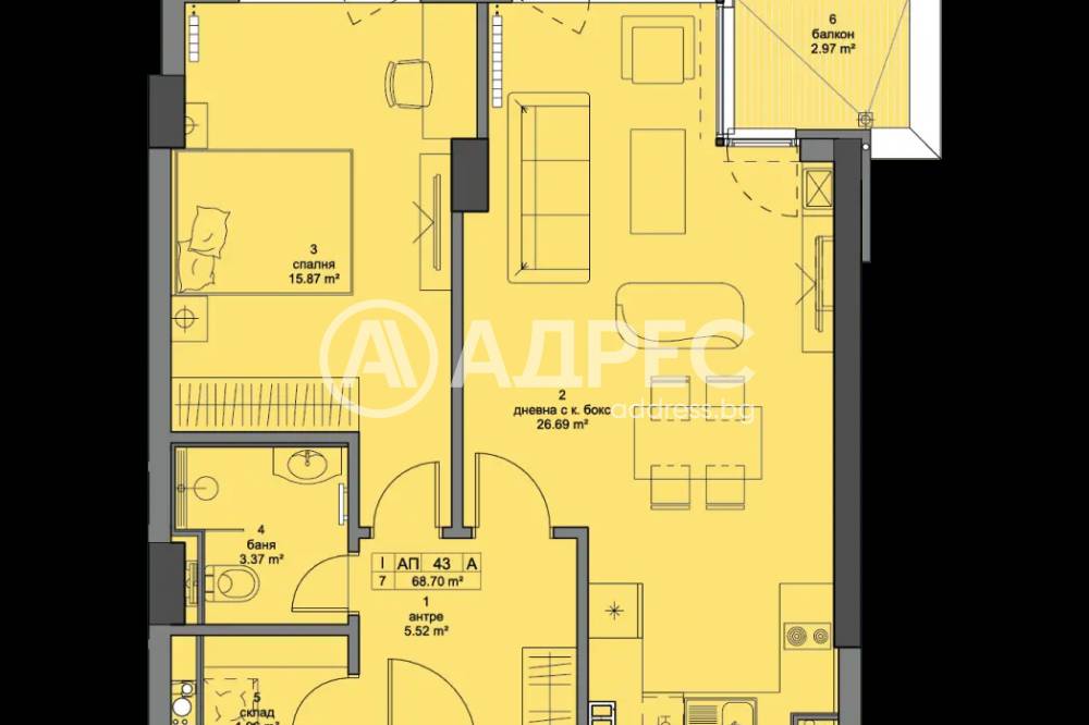 Двустаен апартамент със северно изложение. Състои се от антре, дневна с кухня и трапезария с излаз на балкон, спалня, баня с тоалетна и склад. РЗП 81,21кв.м, ЗП 68,7кв.м. Възможност за закупуване на паркомясто.