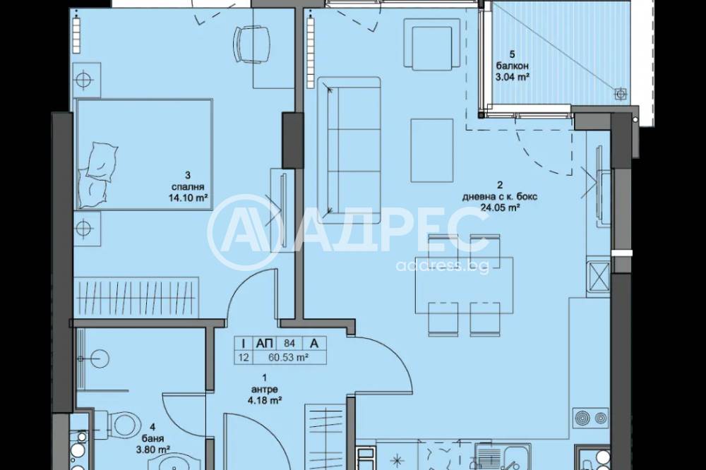 Двустаен апартамент със северно изложение. Състои се от антре, дневна с кухня и трапезария с излаз на балкон, спалня и баня с тоалетна. РЗП 71,55кв.м, ЗП 60,53кв.м. Възможност за закупуване на паркомясто.