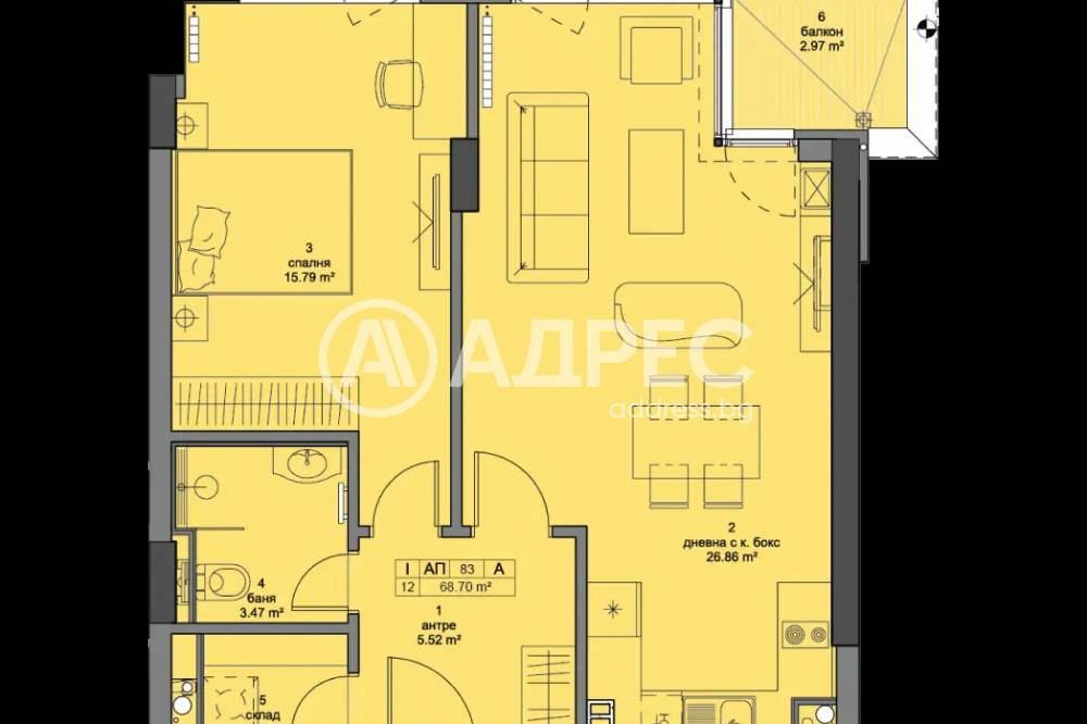 Двустаен апартамент със северно изложение. Състои се от антре, дневна с кухня и трапезария с излаз на балкон, спалня, баня с тоалетна и склад. РЗП 81,21кв.м, ЗП 68,7кв.м. Възможност за закупуване на паркомясто.