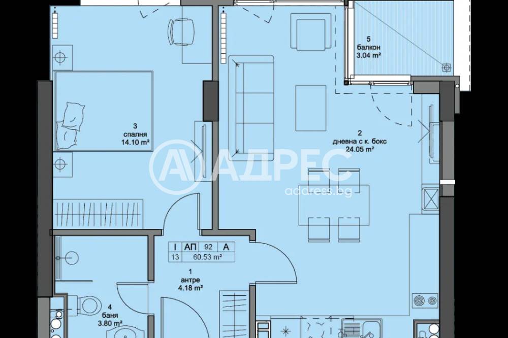 Двустаен апартамент със северно изложение. Състои се от антре, дневна с кухня и трапезария с излаз на балкон, спалня, баня с тоалетна и склад. РЗП 71,55кв.м, ЗП 60,53кв.м. Възможност за закупуване на паркомясто.
