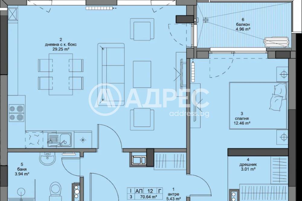 Двустаен апартамент със северно изложение. Състои се от антре, дневна с кухня и трапезария, спалня, баня с тоалетна и балкон с излаз от всяка стая. РЗП 83,75кв.м, ЗП 70,64кв.м. Възможност за закупуване на паркомясто.