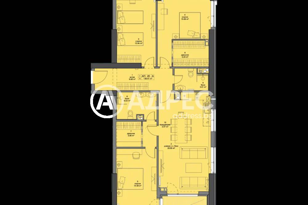Четиристаен апартамент с изложение юг-север. Състои се от антре, дневна с кухня и трапезария, 3 спални, към едната от които баня с тоалетна и дрешник, към втората дрешник, отделно баня с тоалетна и балкон с излаз от всекидневната и едната спалня. РЗП 161,94кв.м, ЗП 136,47кв.м. Възможност за закупуване на паркомясто.