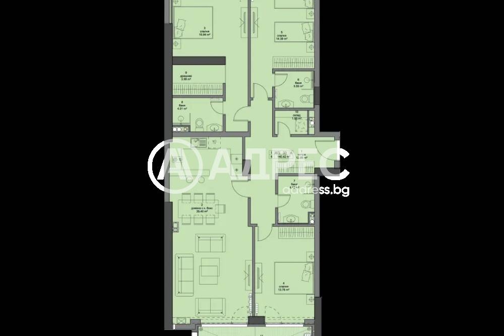Четиристаен апартамент с изложение юг-север. Състои се от антре, дневна с кухня и трапезария, 3 спални, към едната от които баня с тоалетна и дрешник, към втората баня с тоалетна, отделно баня с тоалетна и балкон с излаз от всекидневната и едната спалня. РЗП 166,24кв.м, ЗП 140,42кв.м. Възможност за закупуване на паркомясто.