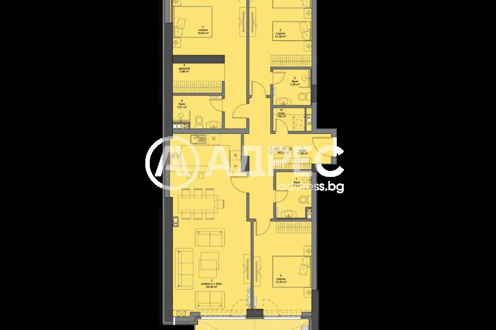 Четиристаен апартамент с изложение юг-север. Състои се от антре, дневна с кухня и трапезария, 3 спални, към едната от които баня с тоалетна и дрешник, към втората баня с тоалетна, отделна баня с тоалетна, склад и балкон. РЗП 169,15кв.м, ЗП 142,88кв.м. Възможност за закупуване на паркомясто.